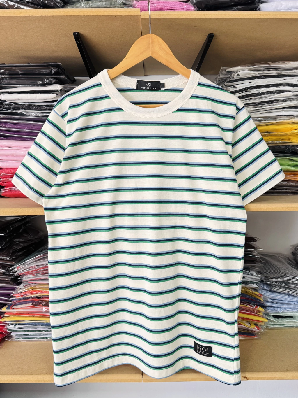 Remera sin género, confeccionada en algodón 100%, rayada crudo, azul, celeste & verde, cuello crudo